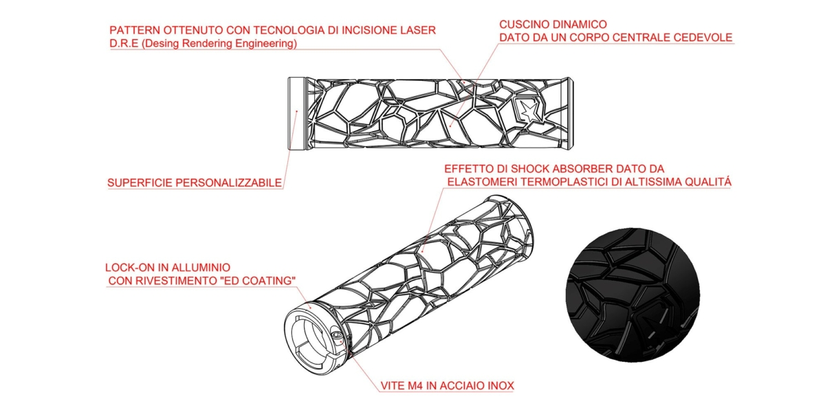Il pattern è frutto di uno studio sulle linee “vescicolari” delle rocce magmatiche; la superficie della manopola è stata ricavata “scavando” nella figura dello stampo con l’ausilio della tecnologia di incisione laser D.R.E. Design Rendering Engineering. Basta soffermarsi sui singoli elementi visibili in rilievo per notare con quanta precisione sia stata realizzata questa nuova texture, che rimanda all’idea di minuscole “scheggiature” sulla gomma